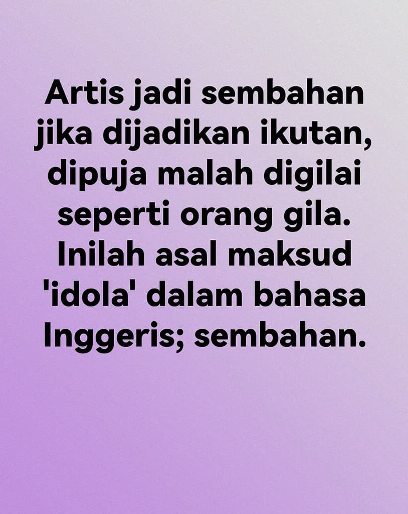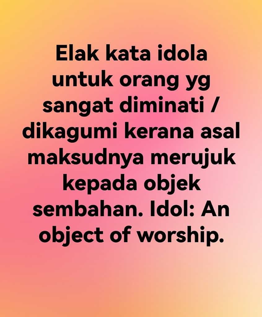 Elakkan menggunakan perkataan idola apabila merujuk kepada orang yang sangat diminati dan dikagumi. Ini kerana asal maksud perkataan ini dalam bahasa Inggeris merujuk kepada apa yang dijadikan sebagai objek sembahan…