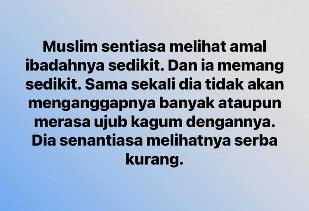Muslim sentiasa melihat amal ibadahnya sedikit. Dan amalan ibadahnya memang sedikit dan dia melihatnya begitu. Sama sekali dia tidak akan menganggapnya banyak ataupun merasa ujub kagum dengannya. Sebaliknya dia senantiasa…