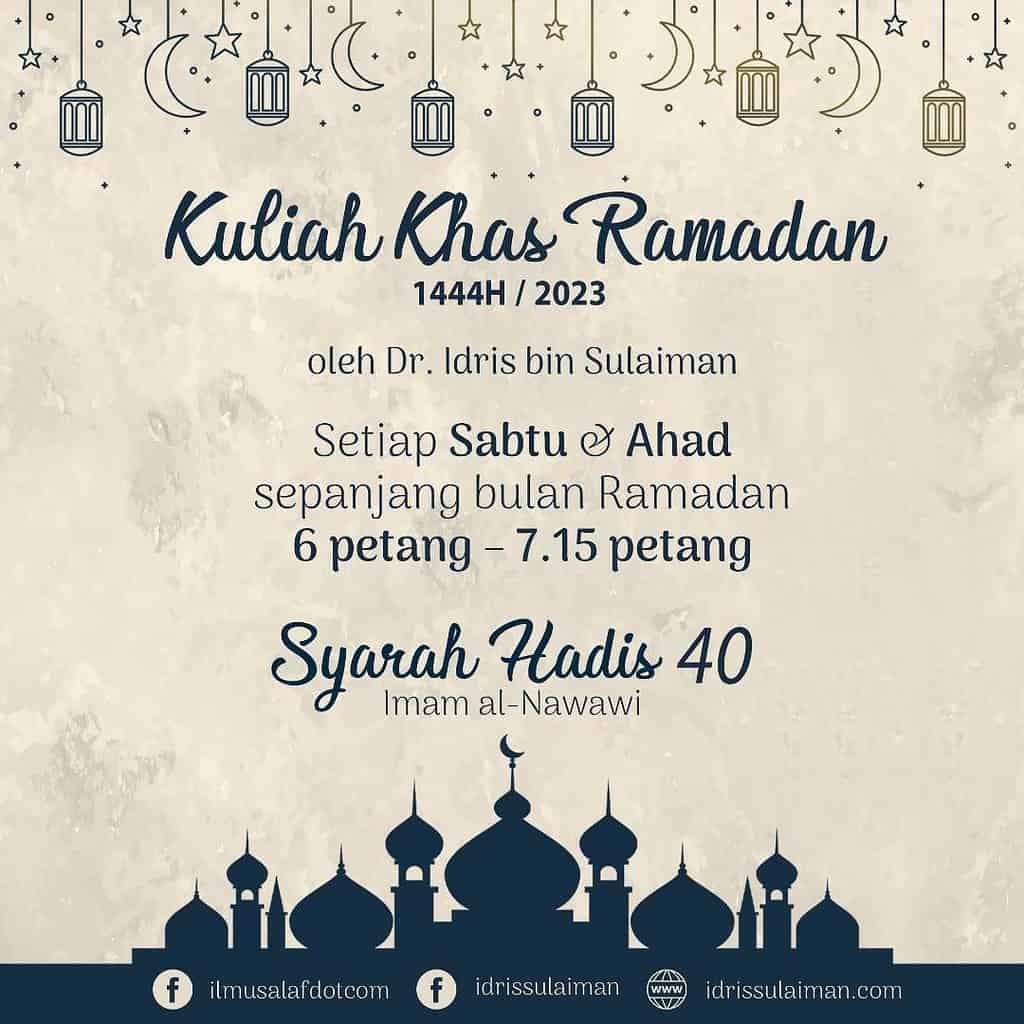 Bulan Ramadan yang mulia semakin hampir. Dengan izin Allah, sepanjang bulan Ramadan nanti akan diadakan kuliah khas membahaskan buku Syarah Hadis 40 Imam al-Nawawi pada setiap hari Sabtu & Ahad,6…