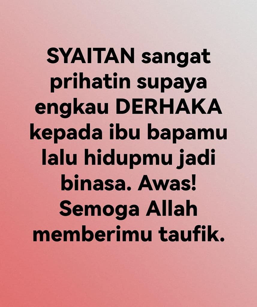 Syaitan sangat prihatin supaya engkau derhaka kepada ibu bapamu lalu hidupmu jadi binasa. Awas! Semoga Allah memberimu taufik. Dr. Idris bin SulaimanKajang22 Syaaban 1444H15 Mac 2023