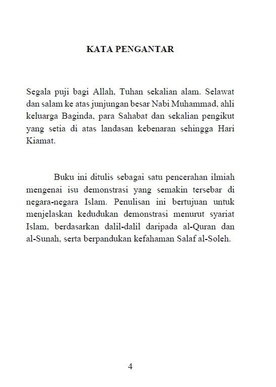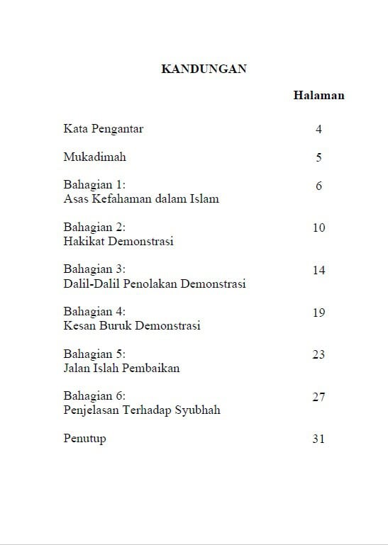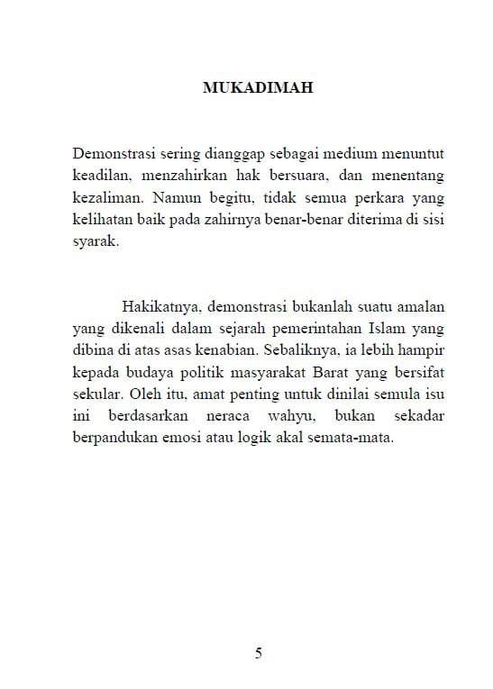 Dengan hujah-hujah yang jelas dan berpaksikan manhaj Ahlus Sunnah, buku ini menegaskan bahawa pembaikan dalam Islam mestilah melalui jalan ilmu, nasihat, sabar dan doa, bukan melalui provokasi dan kekacauan. Ia juga menjawab pelbagai syubhah yang cuba menghalalkan demonstrasi atas nama kebebasan dan keadilan.